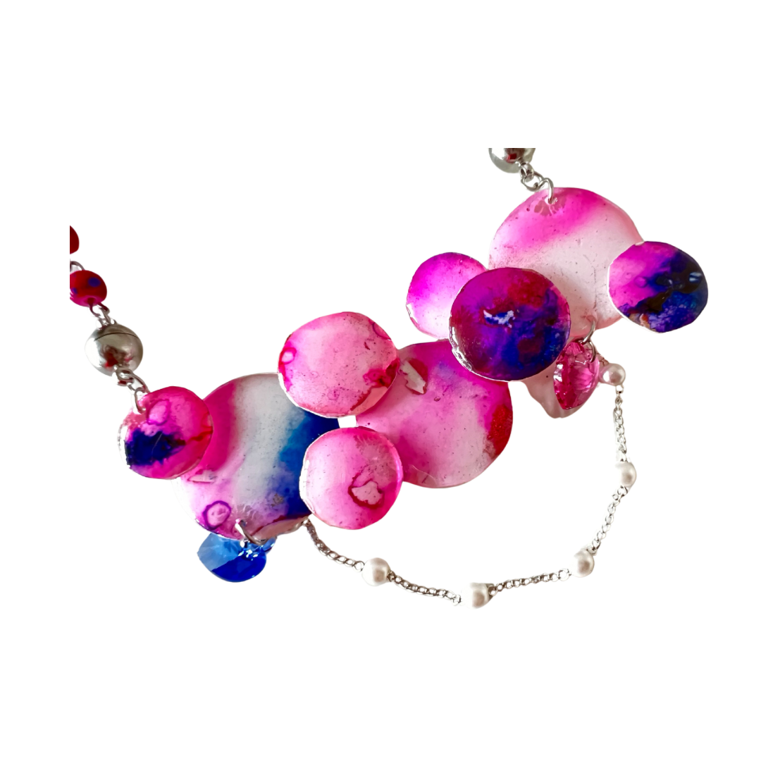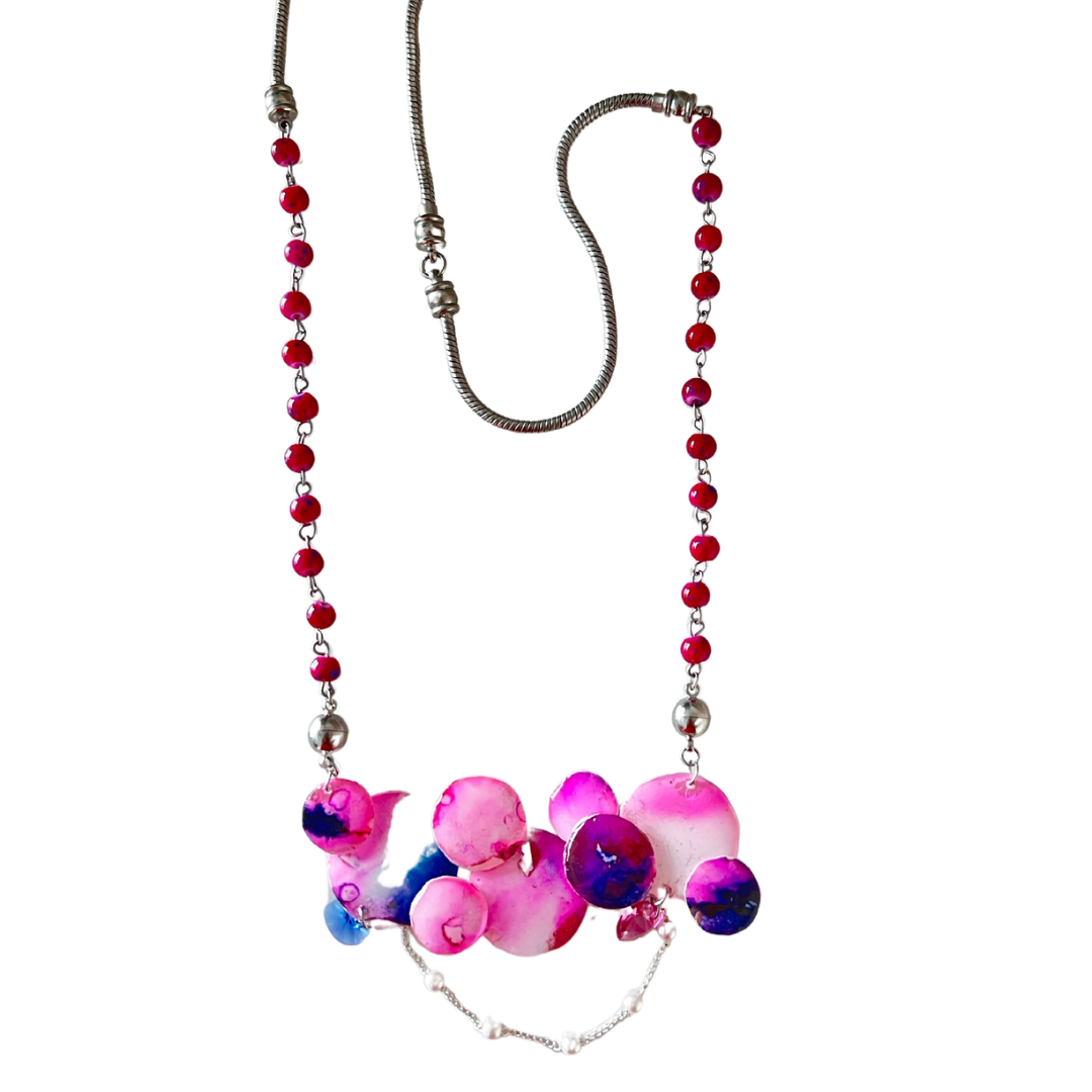 Discover our unique, one-of-a-kind alcohol ink statement necklaces. Each piece is a vibrant, wearable work of art, perfect for adding a pop of color and creativity to any outfit. Handmade with care, no two necklaces are alike, ensuring you have a truly exclusive accessory.